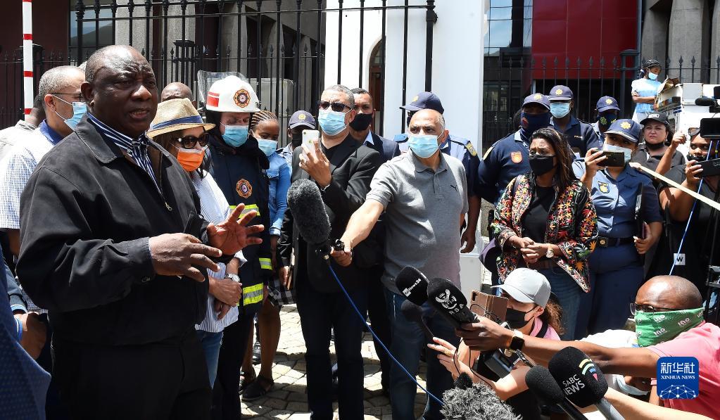 1月2日,南非总统拉马福萨(前左)在开普敦的议会外向媒体说明火灾情况。新华社发(哈比索·姆卡贝拉 摄)