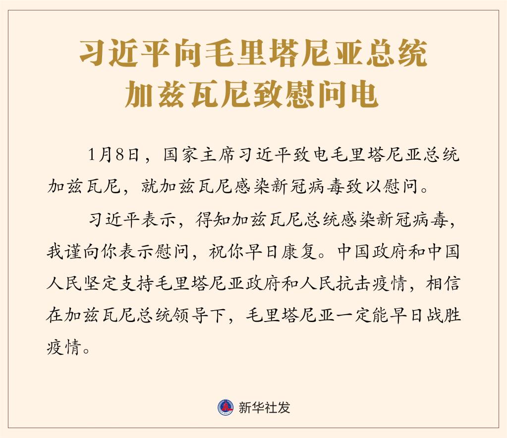 1月8日,国家主席习近平致电毛里塔尼亚总统加兹瓦尼,就加兹瓦尼感染新冠病毒致以慰问。