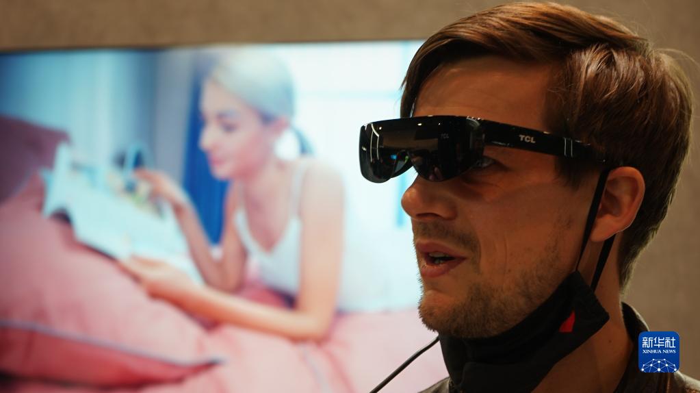 1月5日,一名男子在2022年美国拉斯维加斯消费电子展体验中国公司TCL生产的智能眼镜。新华社发(曾慧摄)