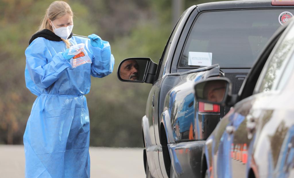 2022年1月10日,医护人员在美国洛杉矶县一处新设立的免下车新冠病毒检测中心工作。(新华社发)