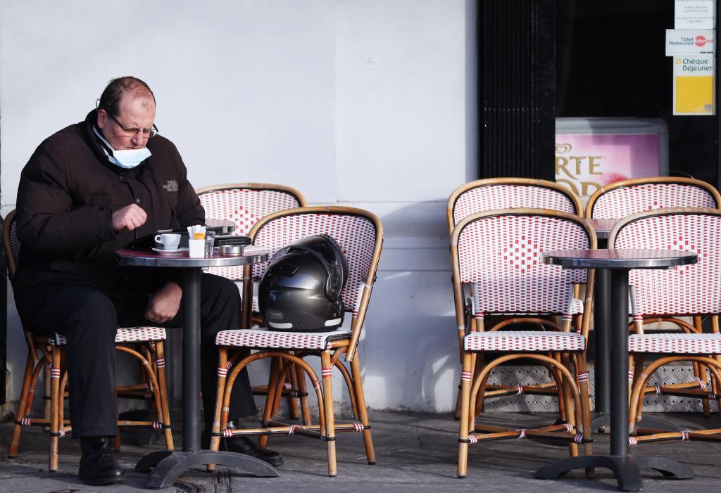 1月5日,一名男子在法国巴黎一家咖啡馆的露天区域喝咖啡。(新华社记者高静摄)