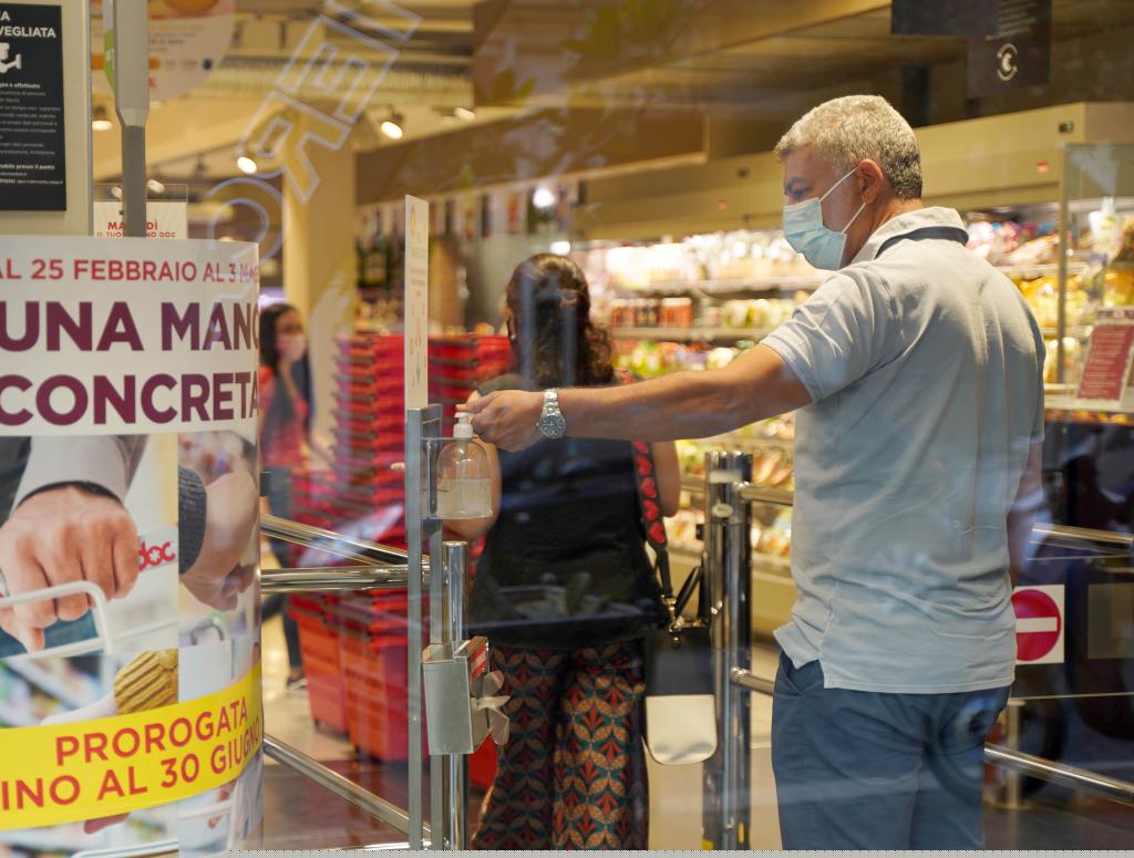 2021年7月15日,一名男子进入意大利罗马一家超市时给手消毒。(新华社记者金马梦妮摄)