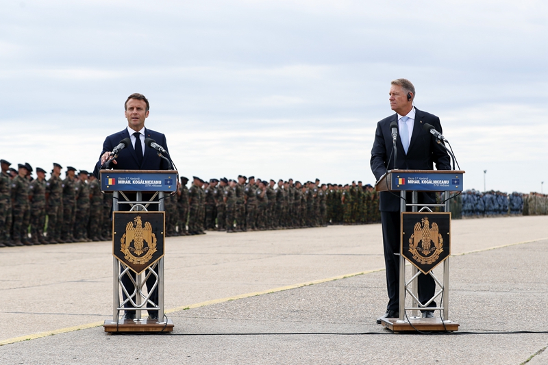 ↑6月15日,正在罗马尼亚访问的法国总统马克龙(左)在黑海沿岸的康斯坦察空军基地发表讲话。新华社发(克里斯泰尔摄)