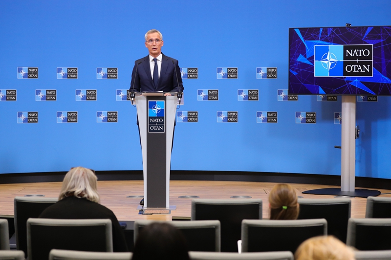 ↑6月16日,在比利时布鲁塞尔的北约总部,北约秘书长斯托尔滕贝格在北约成员国国防部长会议后的新闻发布会上发言。新华社记者 郑焕松 摄