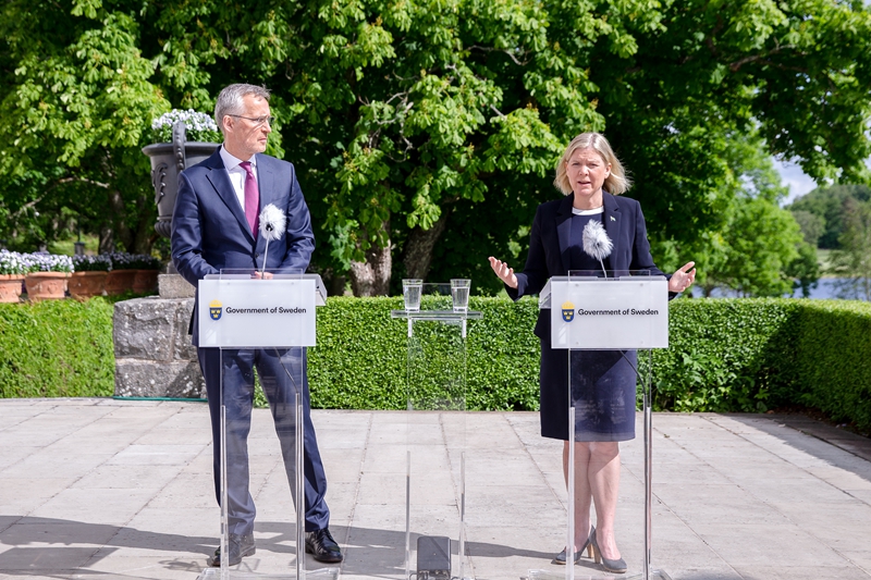 ↑6月13日,瑞典首相安德松(右)与到访的北约秘书长斯托尔滕贝格在瑞典首都斯德哥尔摩以西约120公里的哈普松德首相夏季庄园出席新闻发布会。新华社发(瑞典政府供图/马格努斯·利耶格伦 摄)