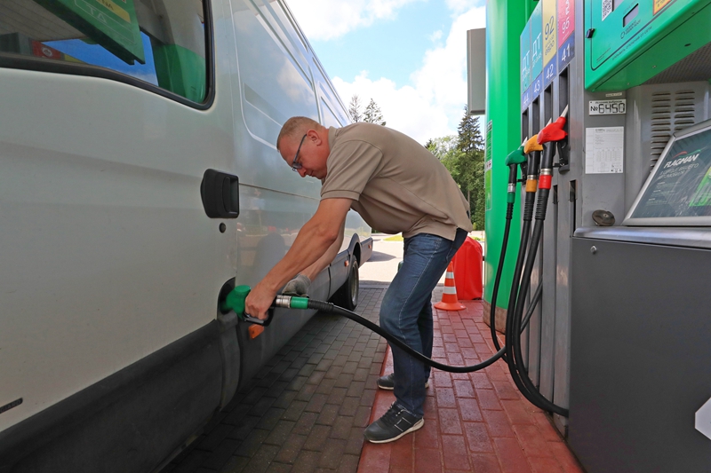 ↑6月14日,一名市民在白俄罗斯明斯克的一处加油站加油。新华社发(任科夫摄)