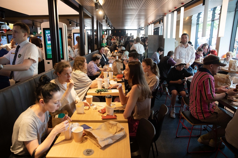 ↑6月12日,顾客在俄罗斯首都莫斯科普希金广场的“只有美味”连锁餐厅用餐。新华社记者 白雪骐 摄