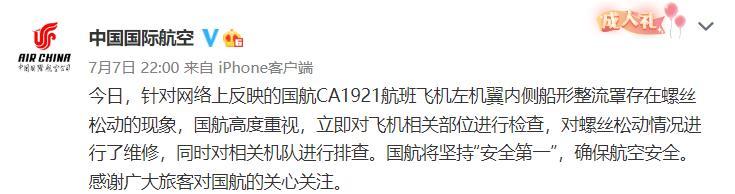 7月7日,针对网络上反映的国航CA1921航班飞机左机翼内侧船形整流罩存在螺丝松动的现象,国航高度重视,立即对飞机相关部位进行检查,对螺丝松动情况进行了维修,同时对相关机队进行排查。国航将坚持“安全第一”,确保航空安全。感谢广大旅客对国航的关心关注。