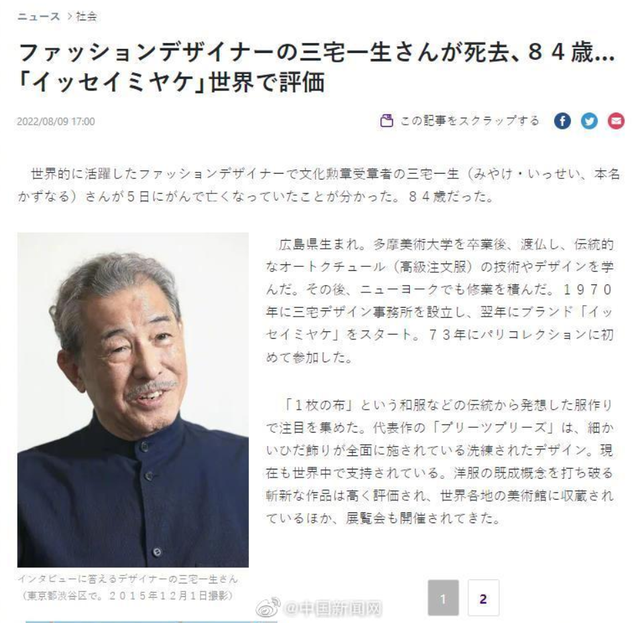 据日本读卖新闻报道,日本著名时装设计师三宅一生8月5日因癌症去世,享年84岁。