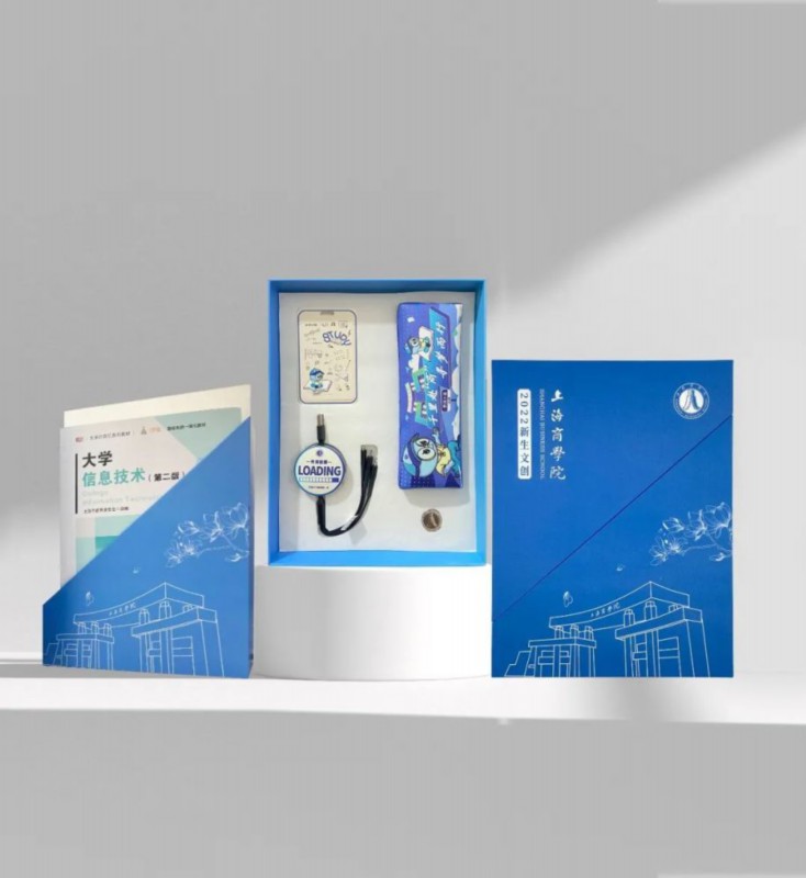为了迎接新同学,启航新征程,上海商学院学生处精心设计“千里赴‘商’.寻梦而行”2022级新生文创,其中创意礼盒可一物多用,分开即可作为书立收纳书籍,倡导大家节约资源、绿色环保。礼盒中包含一枚校徽,标记学子们“上商人”的新身份,期冀学子们秉承“厚德博学、经世济民”的校训砥砺前行。盒内另有与上商学子日常生活学习息息相关的卡套、笔袋、多功能数据线,还有一个“未来可期”的帆布袋助力学子在今后的校园生活里充满正能量,散发出自己的光芒。