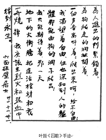 这以后,叶挺被移到“中美合作所” 的白公馆、红炉厂等处囚禁,原先的一切优待尽皆取消。正是在这里,叶挺以“六面碰壁居士” 自称,于11月21日,以伟大的革命家的气魄,写下了流芳百世的“囚歌”: