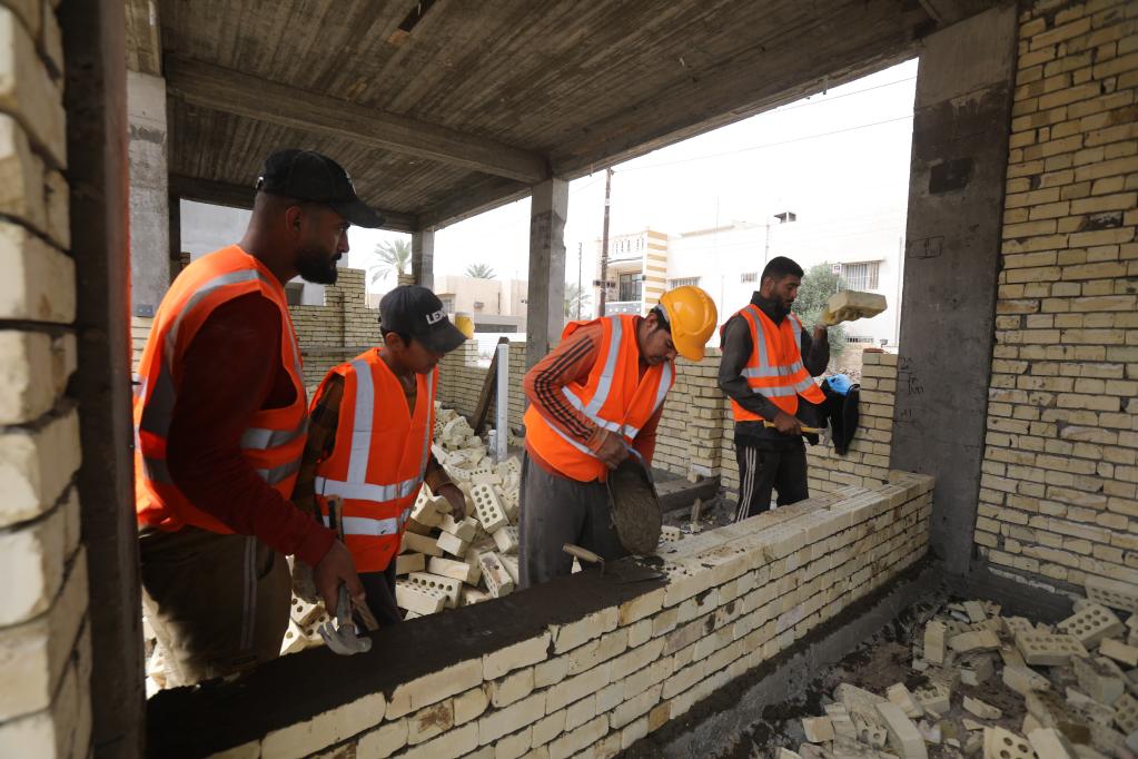 4月9日,在伊拉克巴格达省,伊拉克工人在一处示范学校项目施工现场工作。新华社发(哈利勒·达伍德摄)