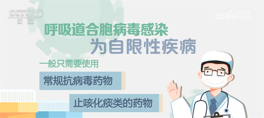 专家表示,如果家庭当中没有新冠病毒感染者,孩子突然出现发热、咳嗽等症状,呼吸道合胞病毒感染的可能性更大。流感病毒感染症状相对较重,以高热为主,往往出现浑身酸痛、恶心呕吐等症状,而合胞病毒感染的典型症状是咳嗽、喘息等。呼吸道合胞病毒感染为自限性疾病,一般只需要使用常规抗病毒药物以及止咳化痰类的药物,症状大多会在1至2周内消失。感染呼吸道合胞病毒后,免疫力一般只能维持几个月,所以孩子上一年感染过,第二年还有再次感染的可能。预防呼吸道合胞病毒感染,首先要养成良好的卫生习惯。