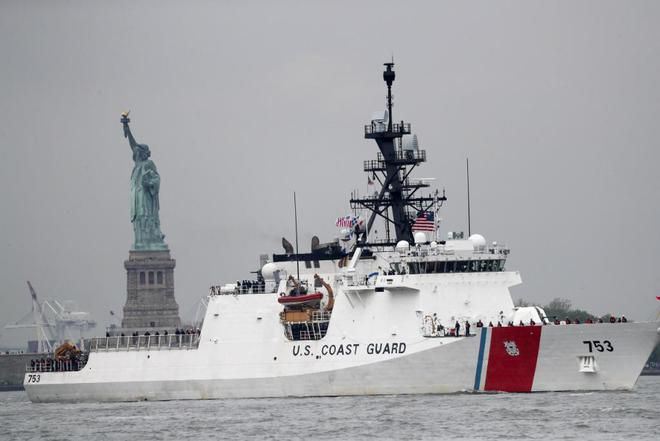 2017年5月24日,在美国纽约,美国海岸警卫队“汉密尔顿号”巡逻舰参加纽约舰队周舰船巡游活动。新华社记者王迎摄