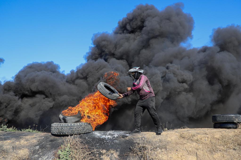 7月3日,在以色列与加沙边境附近,巴勒斯坦抗议者燃烧轮胎。新华社发(里泽克·阿卜杜勒贾瓦德摄)