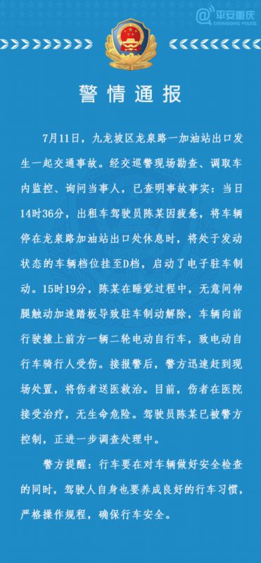据@平安九龙坡微博消息,7月12日晚,重庆市公安局九龙坡区分局发布警情通报。7月11日,九龙坡区龙泉路一加油站出口发生一起交通事故。经交巡警现场勘查、调取车内监控、询问当事人,已查明事故事实:当日14时36分,出租车驾驶员陈某因疲惫,将车辆停在龙泉路加油站出口处休息时,将处于发动状态的车辆档位挂至D档,启动了电子驻车制动。15时19分,陈某在睡觉过程中,无意间伸腿触动加速踏板导致驻车制动解除,车辆向前行驶撞上前方一辆二轮电动自行车,致电动自行车骑行人受伤。接报警后,警方迅速赶到现场处置,将伤者送医救治。目前,伤者在医院接受治疗,无生命危险。驾驶员陈某已被警方控制,正进一步调查处理中。