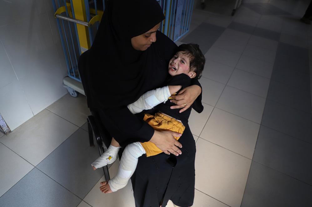 图为11月9日,在加沙地带南部城市汗尤尼斯一处医院,一名女子怀抱一名受伤的儿童。新华社发