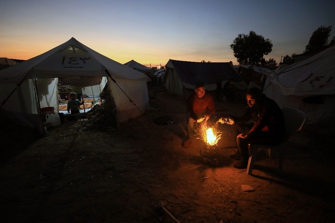 12月18日,在加沙地带南部城市拉法,人们在临时避难所休息。新华社发(亚西尔·库迪摄)