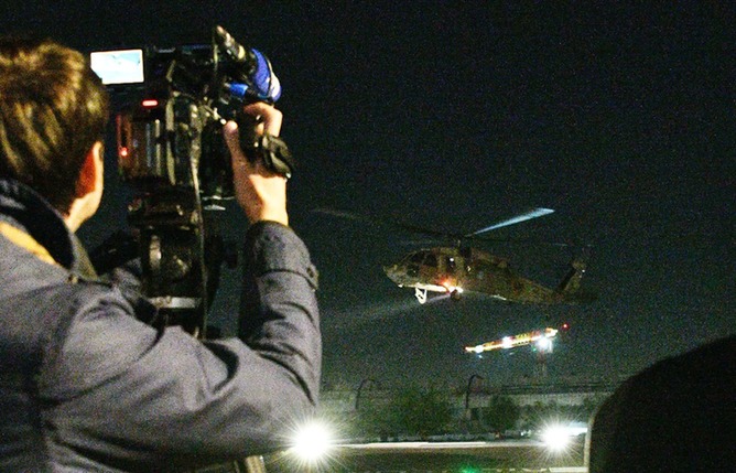 11月30日,哈马斯释放的第七批被扣押人员中的2人搭乘直升机抵达以色列拉马特甘的一所医院。新华社/基尼图片社