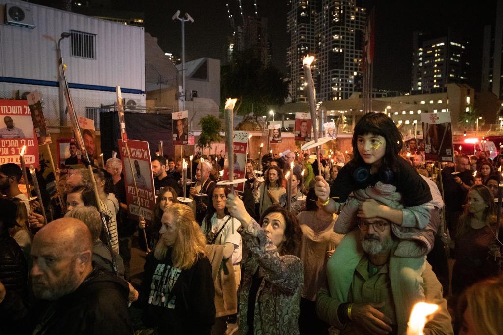 12月7日,在以色列特拉维夫,人们手举点亮的蜡烛参加集会,祈盼被扣留在加沙地带的人员早日归来。新华社记者陈君清摄