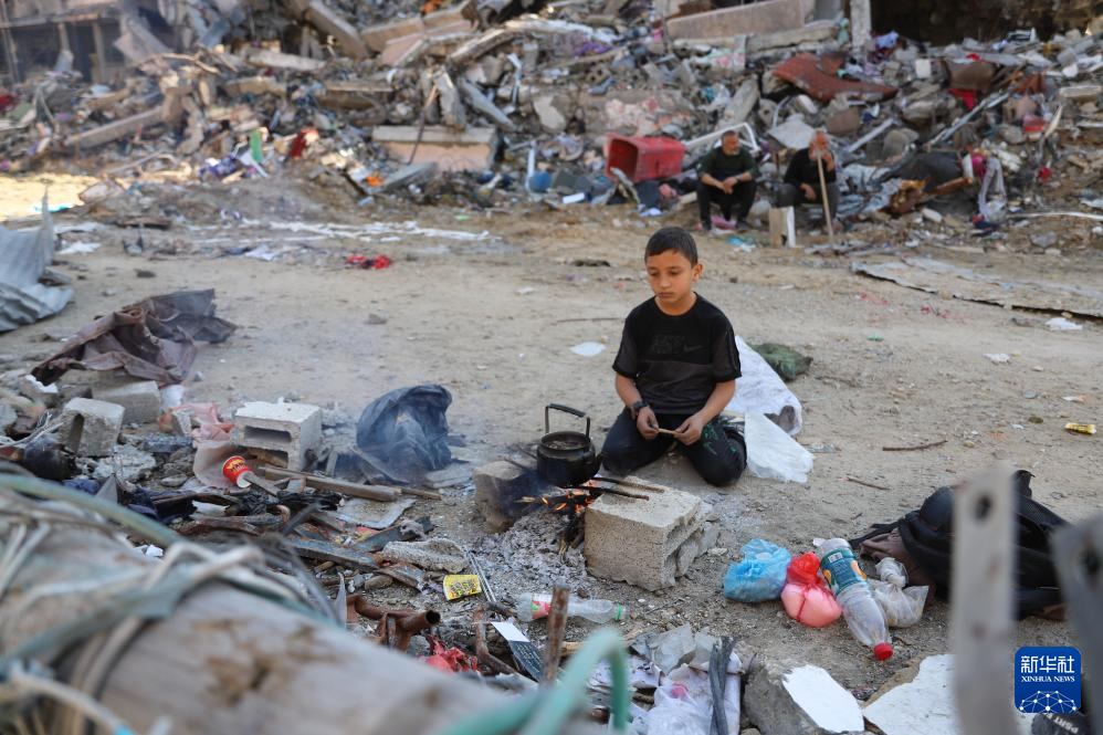 1月7日,一名男孩在加沙城的废墟旁生火。
