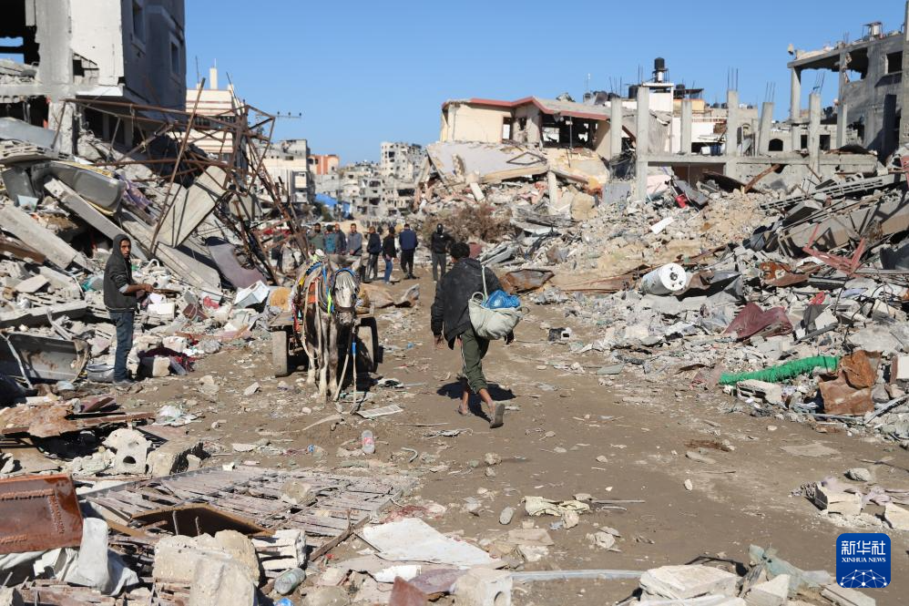 1月7日,巴勒斯坦人骑车经过加沙城的建筑废墟。