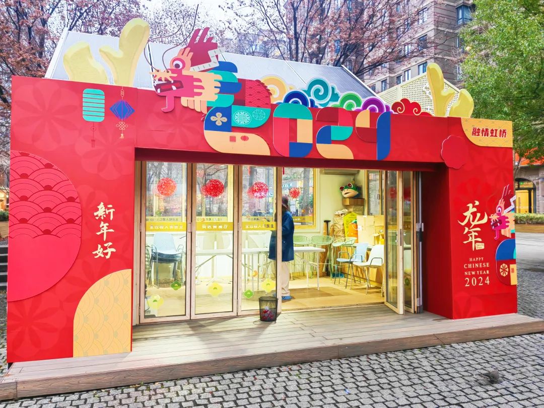 走近“融·古北驿站”,一条蜿蜒的“巨龙”映入眼帘。龙身上装点着色彩斑斓的2024。一旁的“祥龙送福”墙上,新春祝福语被翻译成各国语言,让这个国际街区的中外居民共襄即将到来的新春盛会。