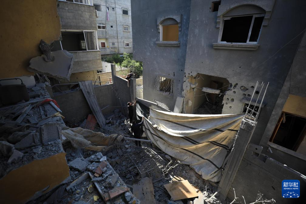 2月24日,在加沙地带南部城市拉法,人们查看以军空袭后的受损情况。