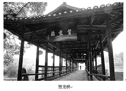 贺龙桥是一座富有湘西民族特色的石木结构的瓦屋桥。在这座桥头,贺龙曾组织家乡人民成立了工农革命军。短短几年间,贺龙率领的红二军团,一次次从这里经过,转战湘鄂川黔。他和任弼时率领的红二、六军团,通过这座桥,挥师北进,踏上漫漫长征路……如今的桥下彩石斑斓,流水潺潺,好似向我们诉说那艰难的峥嵘岁月。站在桥头,放眼望去,在那苍松翠柏交相掩映的高高的陈家山上,巍峨的烈士纪念塔和肃穆的烈士陵园,寄托着革命老区人民对革命先烈们的无限哀思。