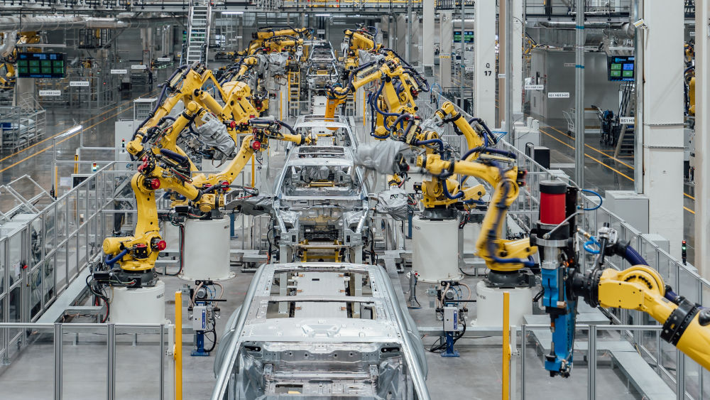 这是在重庆市两江新区拍摄的赛力斯汽车超级工厂焊装车间生产线(2024年2月26日摄,无人机照片)。新华社发(高彰摄)