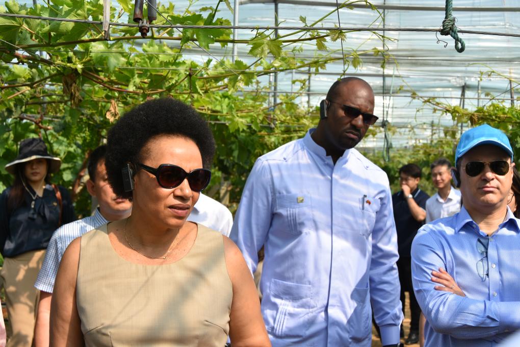 6月8日,驻华使节在烟台半月湾农业示范基地了解当地农业生产技术。新华社记者丛佳鑫 摄