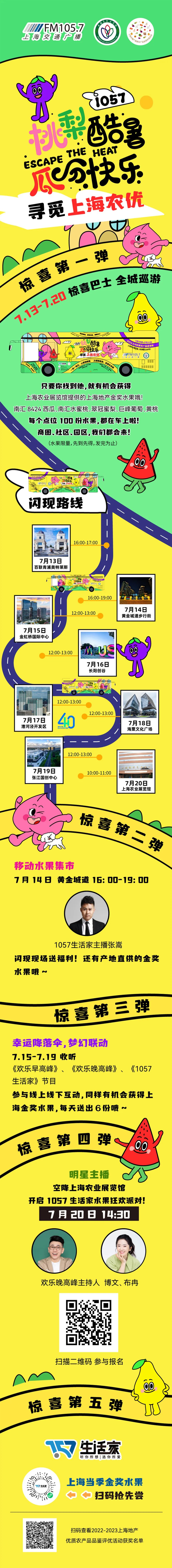 7月13日起,上海农业展览馆联合上海交通广播1057生活家推出的“‘桃梨’酷暑 ‘瓜’分快乐”寻觅上海农优活动正式启动。届时“水果巴士”将进行全城巡游,在特定点位限时限量免费发放上海地产金奖水果,还有移动水果市集,让市民一饱口福、满载而归。