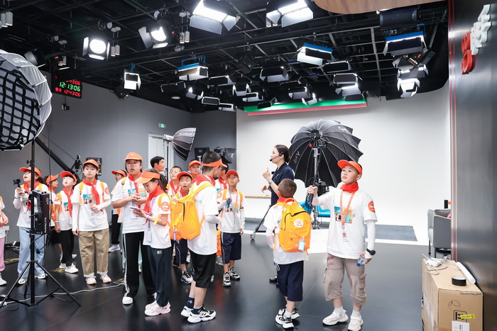研学第一站,孩子们在快手园区不仅拿到了属于自己人生中的“第一张工卡”,听快手的大同学们分享自己的生活和工作;在演播中心,听专业人士讲解直播技术,感受科技为生活带来的便利和改变。