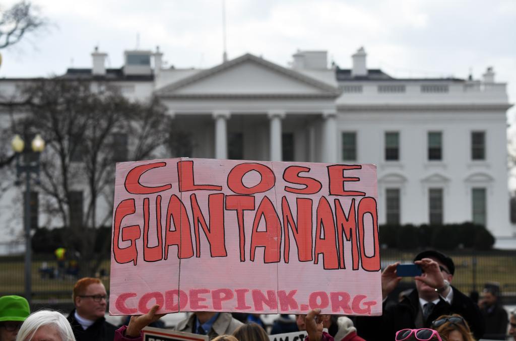 2018年1月11日,人们在美国华盛顿白宫外参加抗议活动,要求关闭关塔那摩监狱。新华社记者殷博古摄