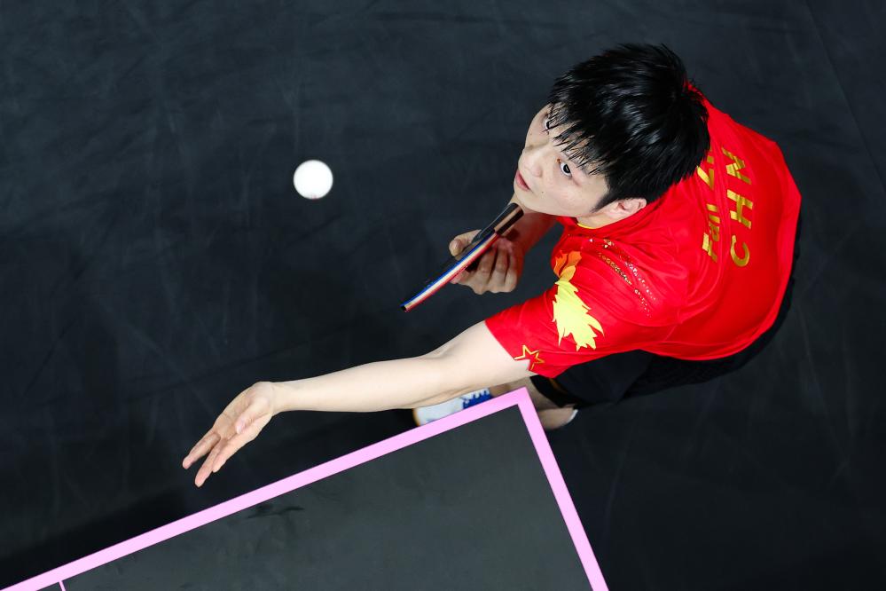 8月2日,樊振东在比赛中发球。新华社记者 陈益宸 摄