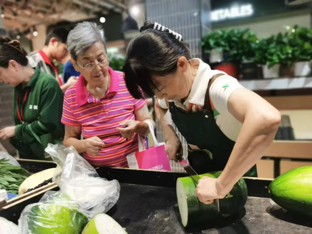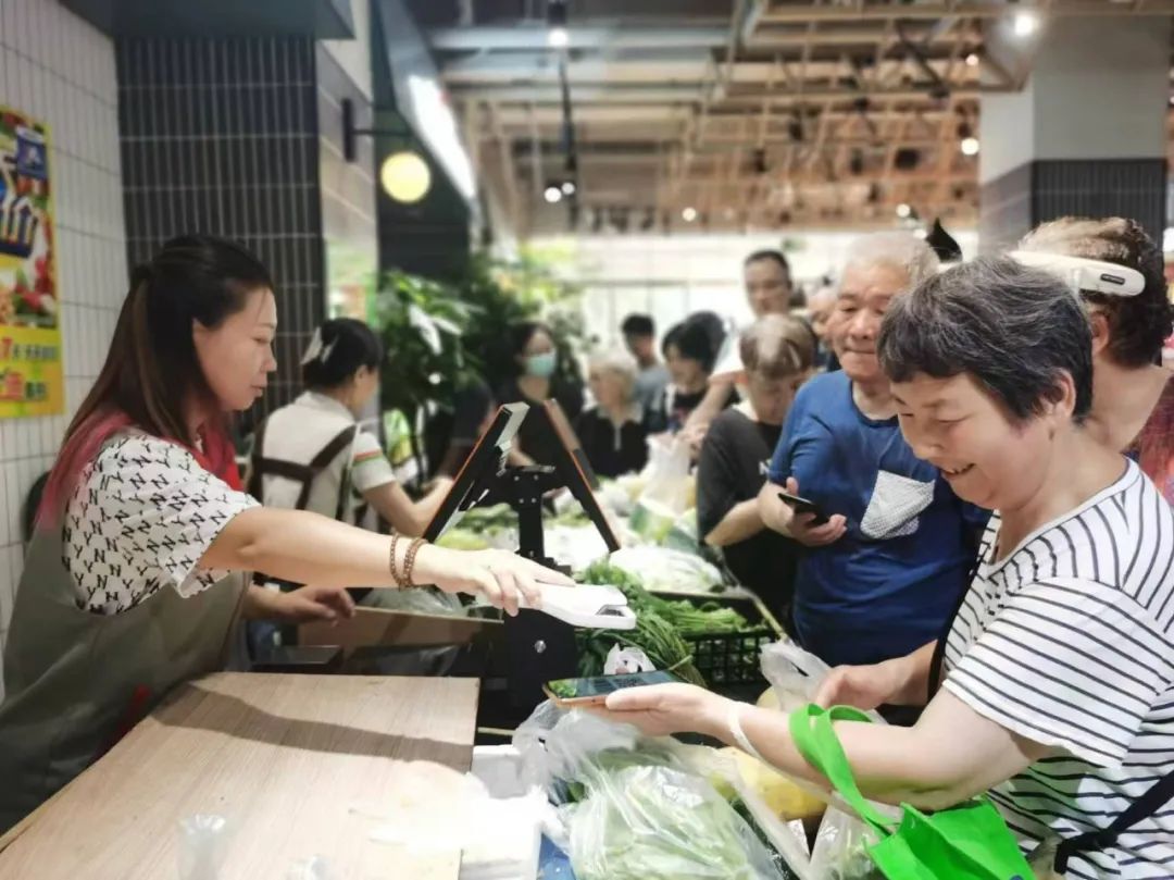 “一把空心菜、4根丝瓜、一块冬瓜、两根玉米,才花了十几元,菜又新鲜又划算,我们几乎天天来!”一大清早,九华邻居里·美天新渔菜市场的“七七平价菜”摊位前便排起了“长龙”。