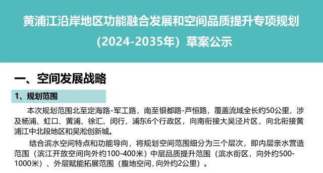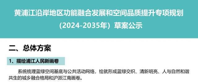 日前,由上海市规划和自然资源局组织编制的《黄浦江沿岸地区功能融合发展和空间品质提升专项规划(2024-2035年)》草案内容开启公示。
