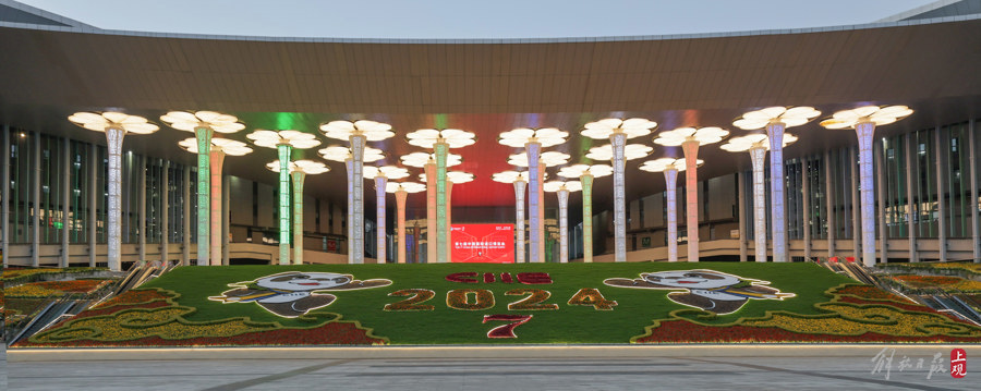 在整个广场空间中,“CIIE”和“2024”字样、四层梯田花海、迷宫花园等多个主题花园采用橙色孔雀草、黄色孔雀草、红色百日草、角堇等各色花卉植物来演绎祥云、渐变云山的纹样效果,更好地营造喜庆热烈的广场氛围。在大草坪上,新设数字“7”LOGO,由彩叶草打造而成。