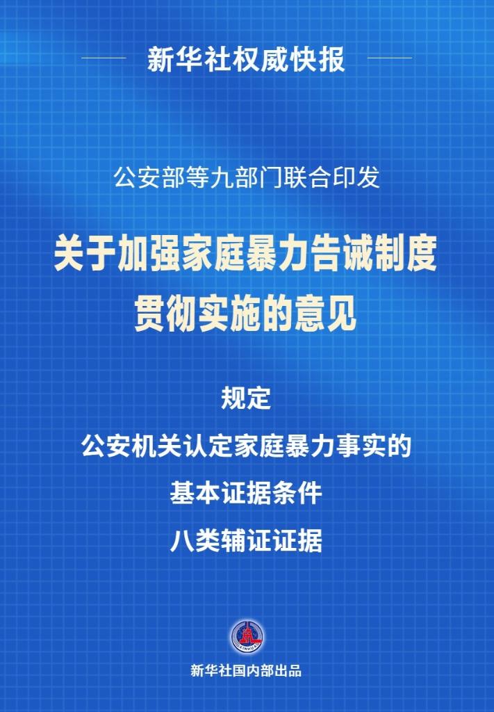 近日,公安部、中央政法委、最高人民法院、教育部、民政部、司法部、国家卫生健康委、全国妇联、国务院妇儿工委办联合印发《关于加强家庭暴力告诫制度贯彻实施的意见》。