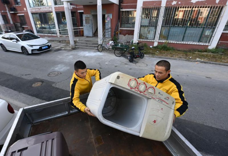 苏宁易购回收工作人员在天津一小区搬运一台回收的旧洗衣机(10月23日摄)。