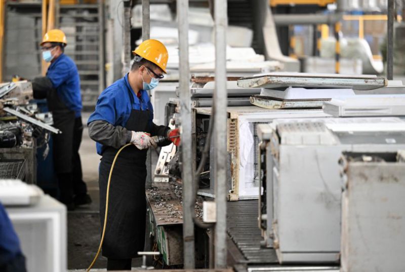 天津一家正规家电拆解企业工作人员在冰箱拆解线分拣拆解后的部件(10月22日摄)。