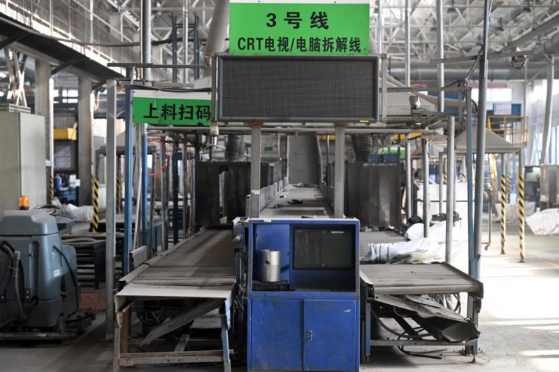 在天津一家正规家电拆解企业的废旧电视电脑处理车间,一条拆解线处于闲置状态(12月5日摄)。该企业废旧电视电脑处理车间有4条拆解线,目前有2条因货源不足处于闲置状态。