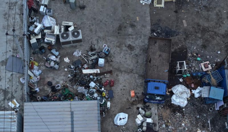 北方某市一农贸市场附近的一处废旧家电拆解“小作坊”,拆解后的废旧家电在露天随意堆放(10月31日摄,无人机照片)。