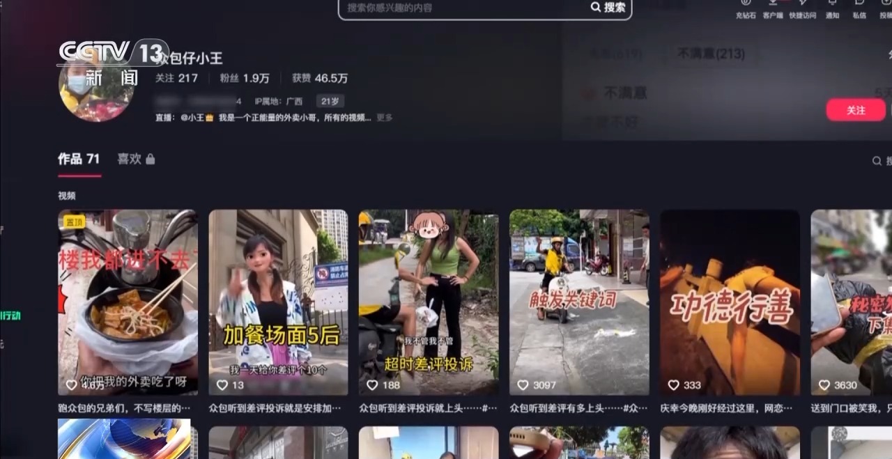 发布这些视频的账号叫“众包仔小王”,不到三个月的时间共发布了71个作品,总获点赞39万余次,总播放量超千万,转发量超10万。从账号发布的内容来看,视频的主角是一名外卖员,而这些视频记录的都是他送餐时遇到的各种无理要求。