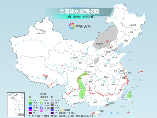 今天,内蒙古中部、新疆沿天山地区、川西高原东部、云贵高原、陕西东部和西南部、山西北部和西南部、河北西北部、北京西部山区等地部分地区有小雪或雨夹雪。四川盆地西部、贵州西部、云南东北部及台湾岛等地部分地区有小雨。