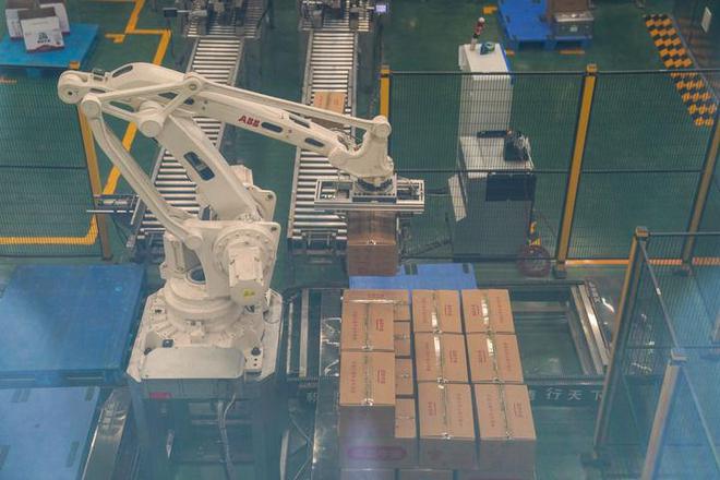 12月21日,在广汉市迈德乐食品有限公司的味控智造车间,机械臂将包装好的牛油从生产线上取出。新华社记者 胥冰洁 摄