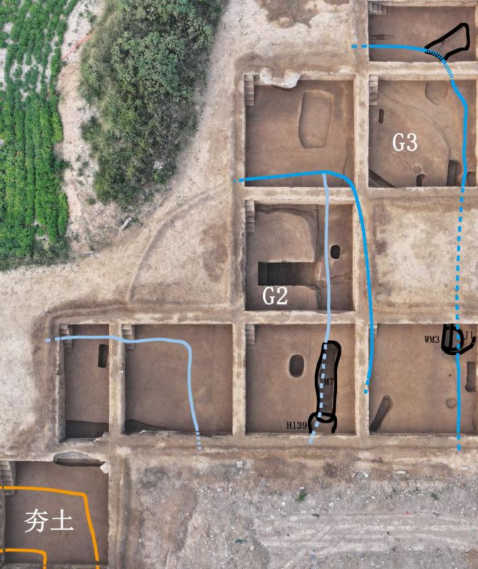 据悉,古城村遗址位于二里头遗址北侧的洛河北岸。2021年发掘以来,已发现二里头文化时期的3条壕沟(G1、G2、G3)和1道夯土墙。