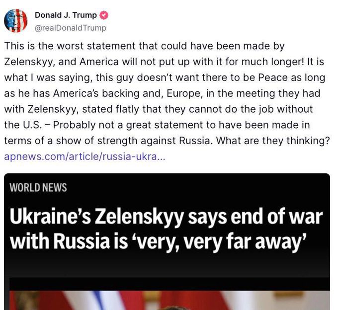 特朗普3日在社交媒体发文,附上美联社题为《泽连斯基说与俄结束战争还“非常非常遥远”》的报道,写道:“这是泽连斯基发表过的最糟糕声明,美国不会容忍太久!”