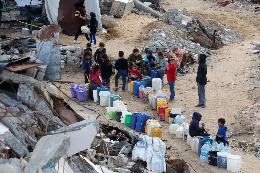 2月19日,在加沙地带北部拜特哈嫩,儿童排队等待取水。新华社发(里泽克·阿卜杜勒贾瓦德摄)