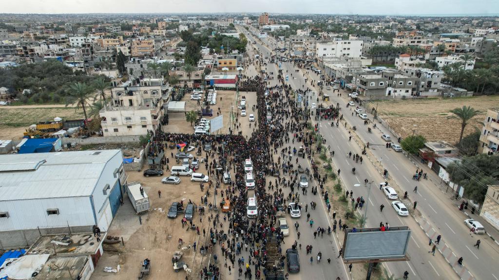 这是2月8日在加沙地带中部代尔拜拉赫拍摄的被释放的第五批被扣押以色列人员移交现场(无人机照片)。新华社发(里泽克·阿卜杜勒贾瓦德摄)